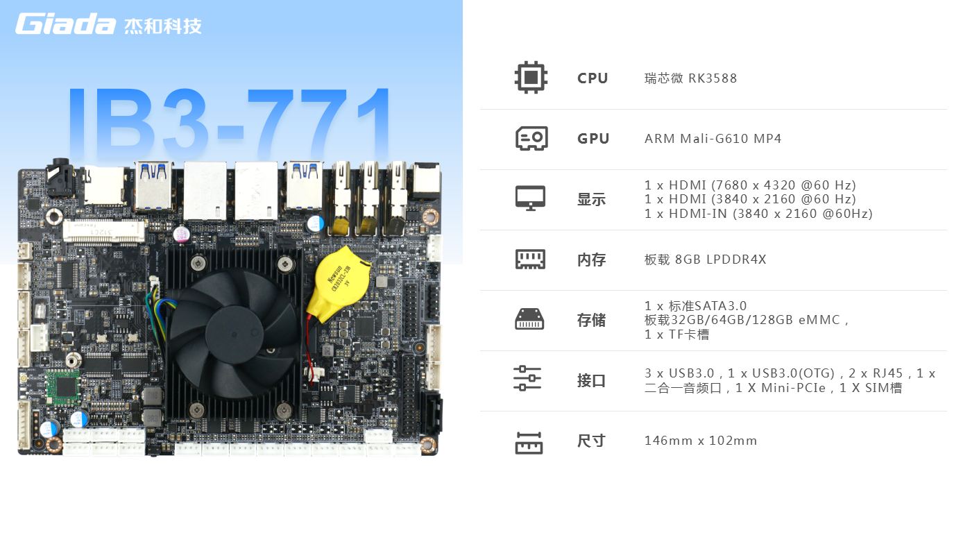 菠菜主板IB3-771内置瑞芯微新一代旗舰级高端芯片RK3588,6TOPS算力的NPU,具有高算力、内存大、超强多媒体、多重扩展等技术优势。支持主流深度学习框架,能够为各类养老 AIOT 应用场景提供更优的性能表现。
